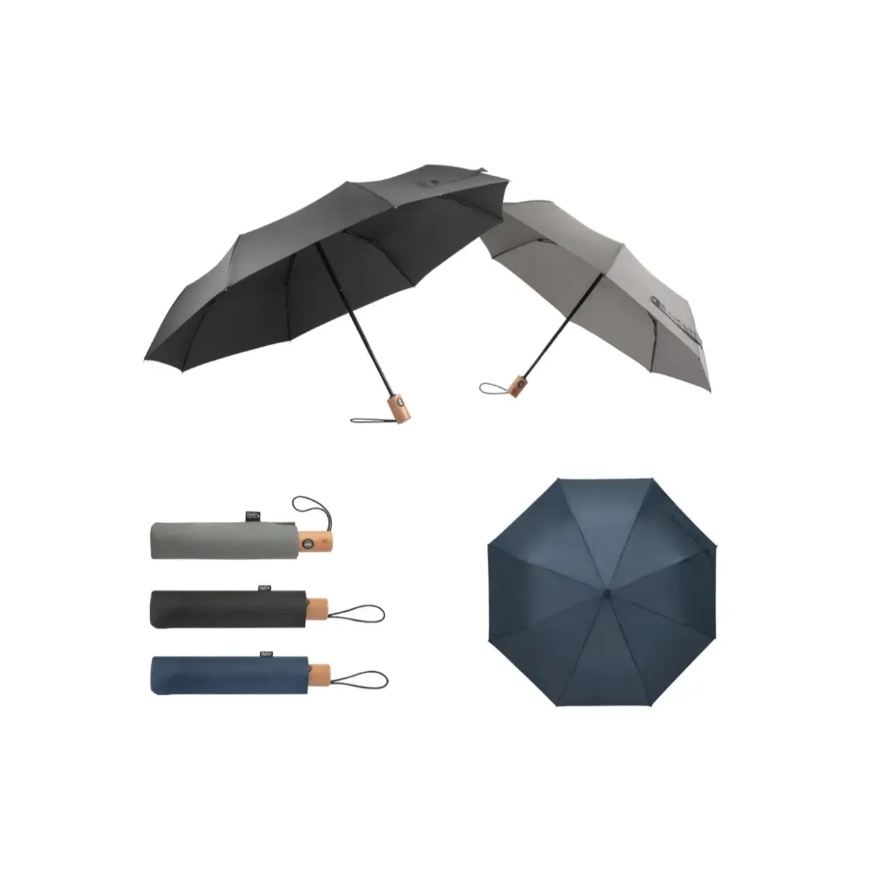 Paraguas con tela impermeable 100% confeccionada con rPET (plástico reciclado), con varillas de fibra de vidrio y mango de madera con elástico para colgar. Se pliega en 3 secciones y es resistente al viento. Cuenta con apertura y cierre automático. Trae funda a color con etiqueta «rPet».